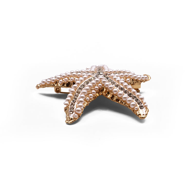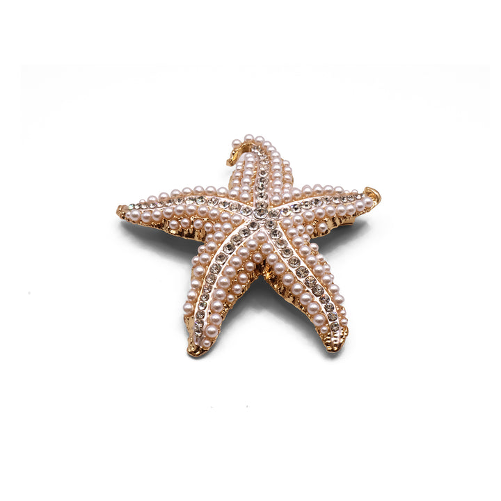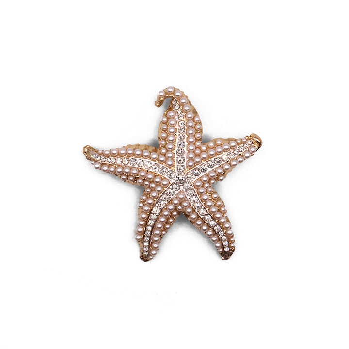 El broche Asteroidea representa una estrella de mar con perlas en los brazos y cristales en el centro. Su acabado dorado y textura detallada le dan un aire elegante y fresco, ideal para un look con glamour marino.