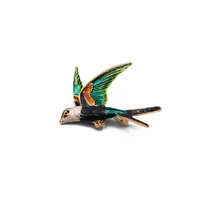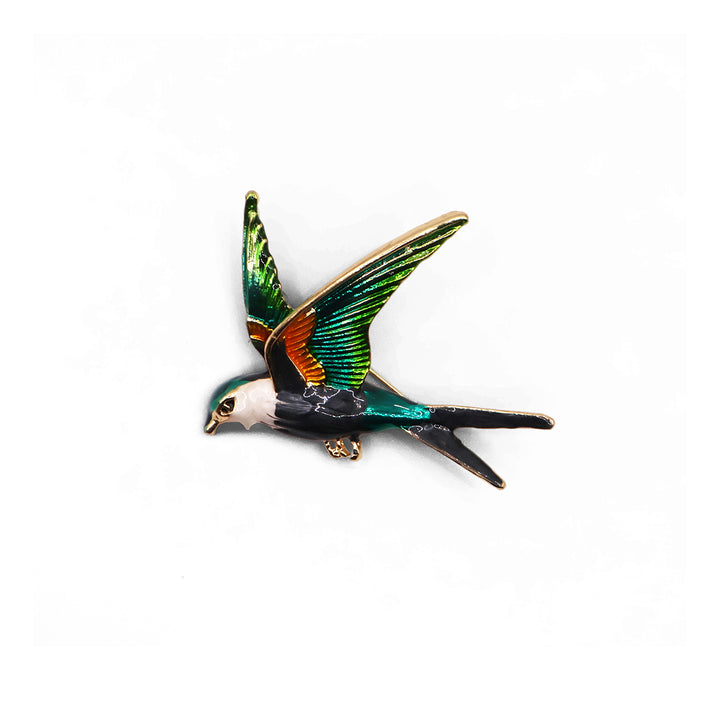 El broche Aucella representa un pájaro en vuelo con alas esmaltadas en tonos verdes, naranjas y negros. Su acabado vibrante transmite movimiento y elegancia, ideal para quienes buscan un accesorio artístico con un toque natural.