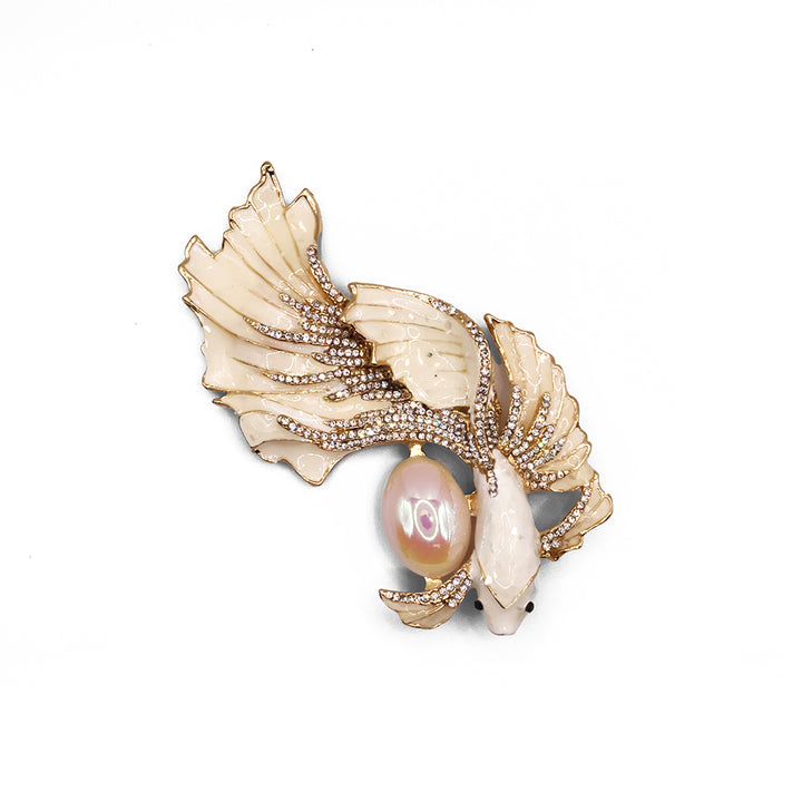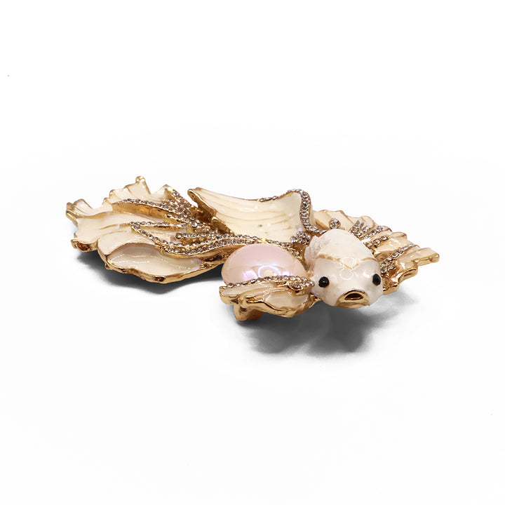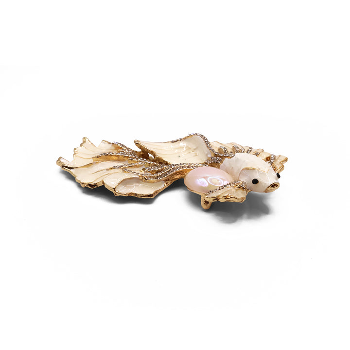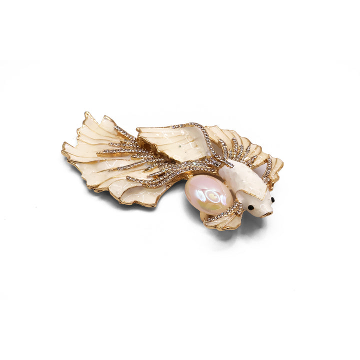 El broche Betta destaca por su diseño delicado y elegante, inspirado en un pez Betta. Con tonos nacarados, detalles dorados y una perla iridiscente al centro, es una pieza femenina y refinada que combina suavidad, elegancia y un sutil toque de lujo.