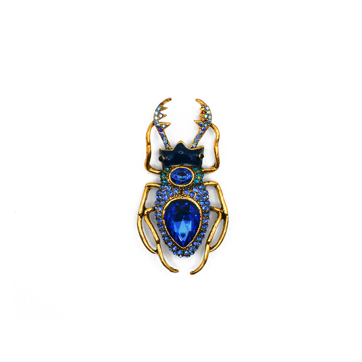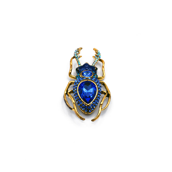 El broche Creta presenta un escarabajo elegante adornado con piedras azules y detalles dorados. Al centro, una piedra en forma de gota destaca su diseño, rodeada de pequeños detalles que aportan un brillo sofisticado. Una pieza llamativa y refinada, ideal para quienes buscan carácter y elegancia en un accesorio.