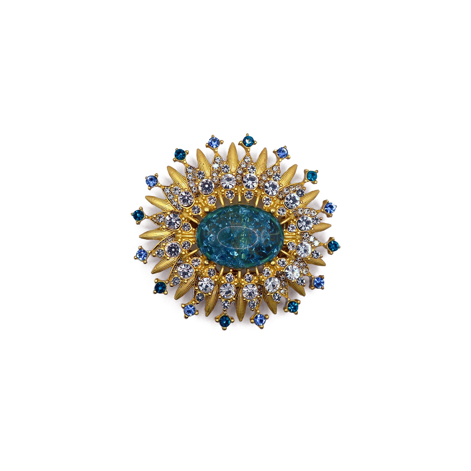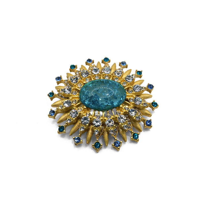 Inspirado en el estilo icónico de la princesa Diana, el broche Diana presenta un diseño floral con un centro azul profundo rodeado de pétalos dorados y cristales brillantes. Elegante y femenino, combina glamour y naturaleza en una pieza sofisticada y llamativa.