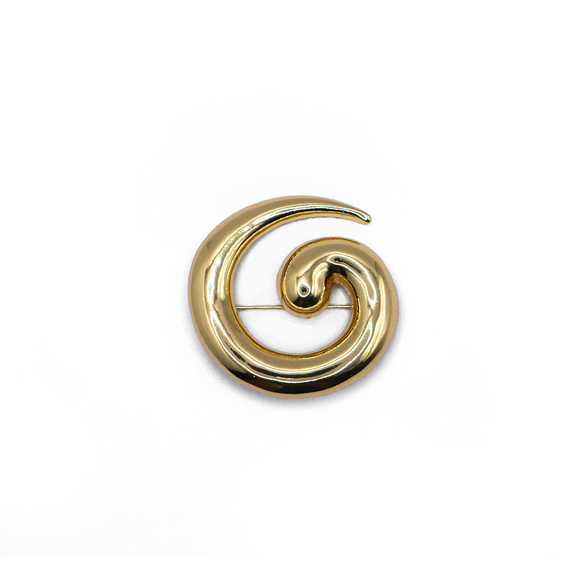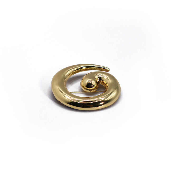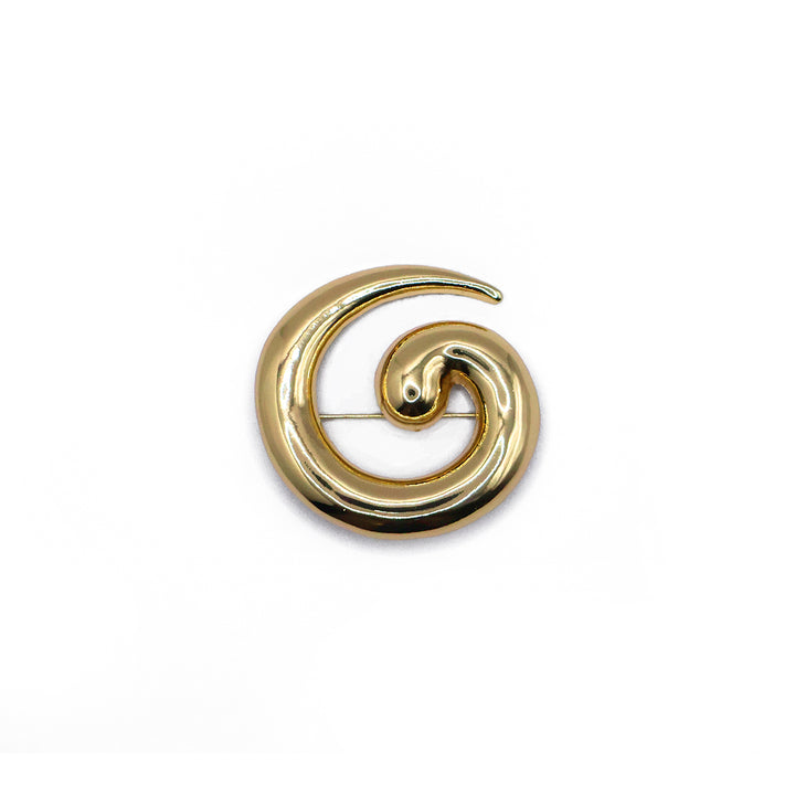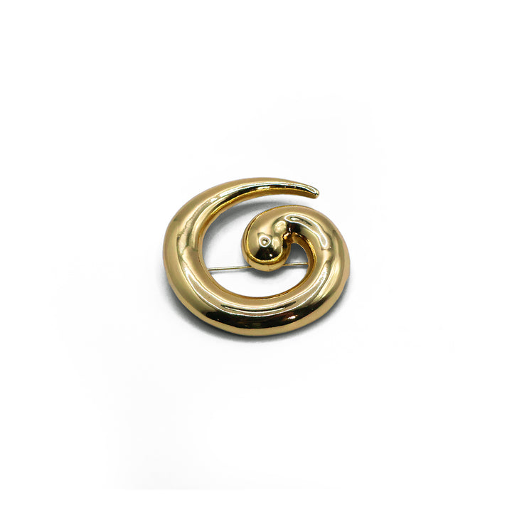 El broche Golden, con forma de espiral inspirada en olas y conchas, combina fluidez y brillo dorado en una pieza artística y sofisticada. Ideal para un toque único y llamativo.