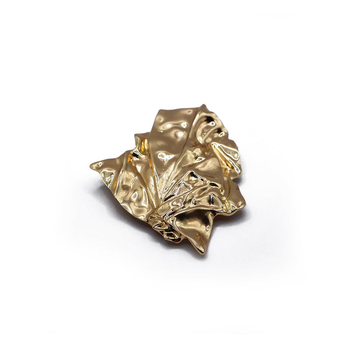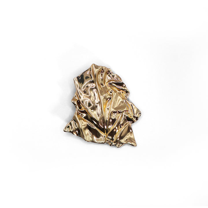 El broche Hoja de Oro presenta un diseño abstracto que imita la textura de una hoja de metal arrugada. Con un acabado dorado brillante, sus formas orgánicas y pliegues irregulares le dan una estética moderna y artística.