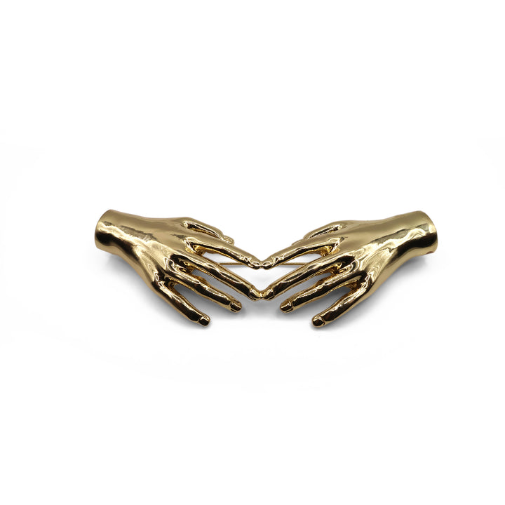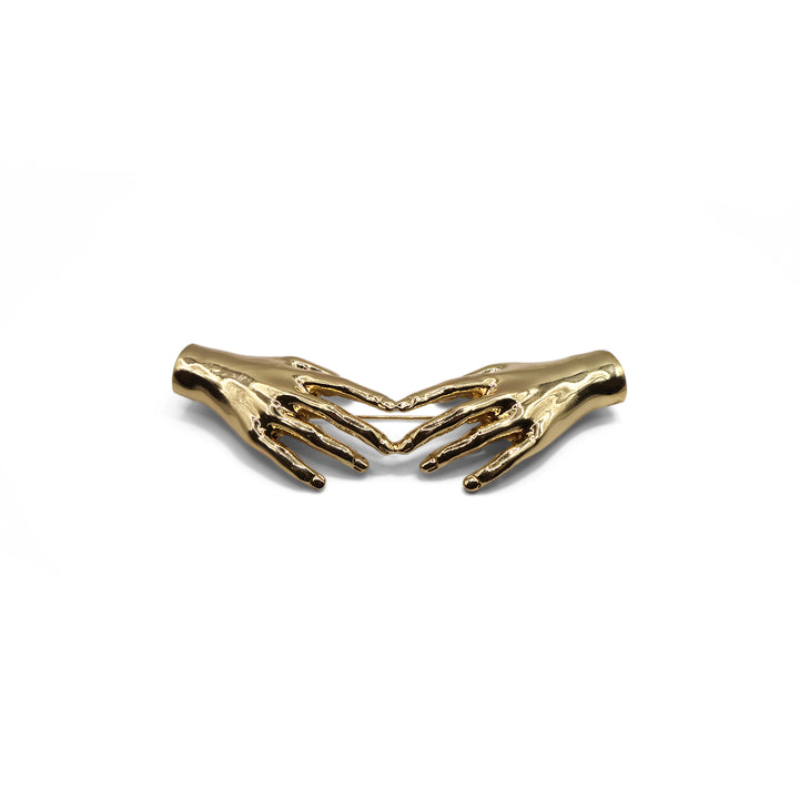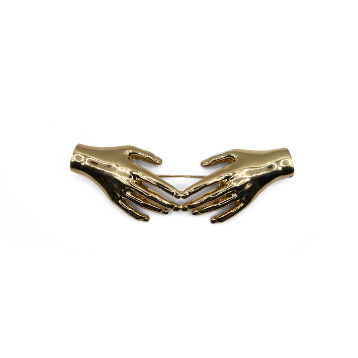 El broche Midas presenta un diseño elegante y artístico con dos manos simétricas que se acercan, creando una forma armoniosa. Su acabado brillante y detallado le otorga un estilo sofisticado y moderno, ideal para realzar cualquier atuendo.