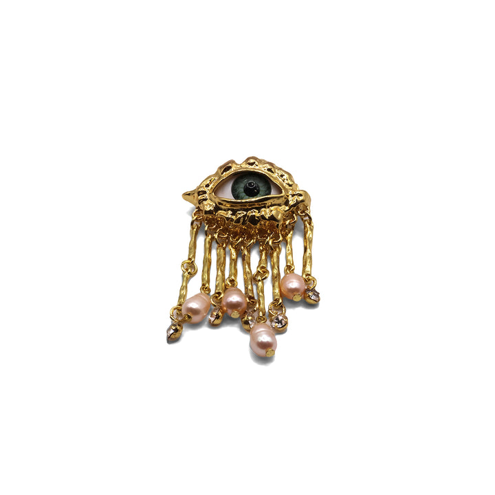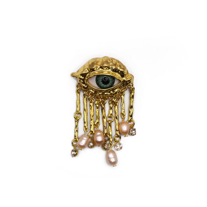 El broche Nostalgia destaca por un ojo central con detalles colgantes que evocan lágrimas. Su acabado dorado aporta sofisticación, mientras el diseño dinámico añade un toque místico y glamuroso.