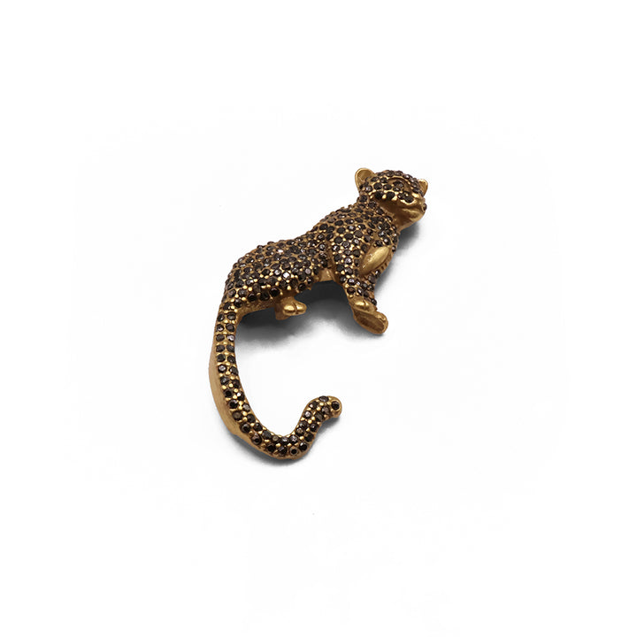 El broche Panterus presenta un leopardo estilizado cubierto de piedras negras que evocan sus manchas. El acabado dorado y el diseño detallado resaltan su elegancia y movimiento, creando una pieza audaz que fusiona lujo y fuerza natural.