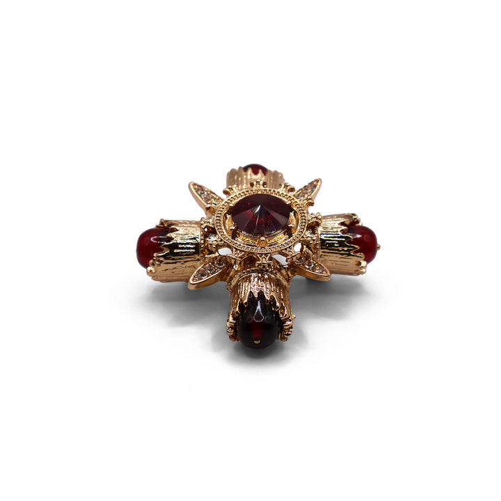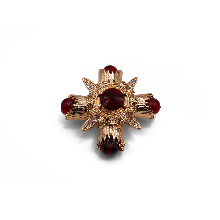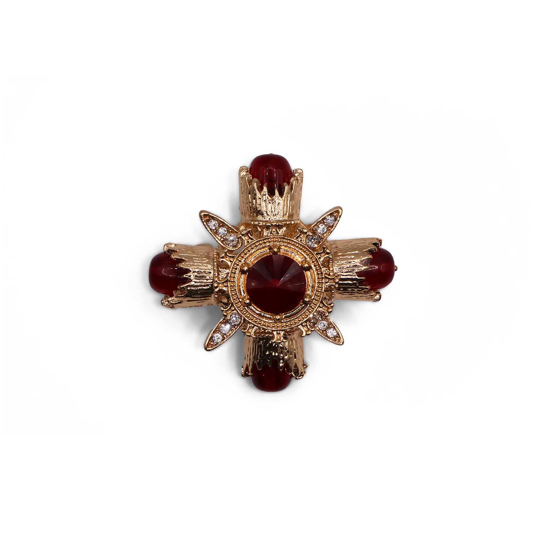 Inspirado en la majestuosidad de la reina Victoria, el broche Victoria presenta una cruz elegante con una piedra roja central y cristales transparentes. Los detalles dorados con acabado texturizado aportan un aire clásico y sofisticado. Una pieza llamativa que combina simbolismo religioso y glamour.